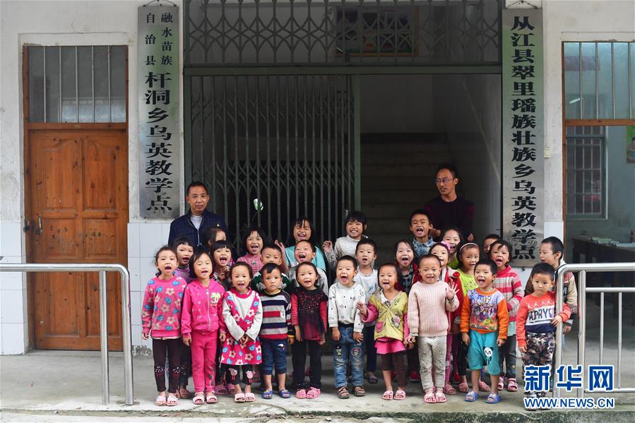 烏英教學(xué)點(diǎn)“一??鐑墒^(qū)”,目前有廣西籍學(xué)生18名,貴州籍學(xué)生9名,廣西貴州籍老師各1名。 烏英苗寨位于黔桂交界的大苗山深處,共有140戶,其中100戶屬?gòu)V西柳州市融水苗族自治縣桿洞鄉(xiāng)黨鳩村,40戶屬貴州省從江縣翠里瑤族壯族鄉(xiāng)南岑村。由于地處偏遠(yuǎn),山多地少,經(jīng)濟(jì)發(fā)展緩慢,目前整個(gè)苗寨還有76戶是貧困戶。 面對(duì)艱巨的脫貧任務(wù),當(dāng)?shù)攸h委政府在努力改善烏英苗寨公共基礎(chǔ)設(shè)施的同時(shí),因地制宜,帶動(dòng)群眾積極發(fā)展特色產(chǎn)業(yè)。從2017年11月至今的一年多時(shí)間,這里發(fā)生了很大改變:10戶村民新建了木樓,120多戶完成“三改”(改廁改廚改圈),1名貧困考生考上大學(xué),1戶購(gòu)買新汽車,4對(duì)新人舉行了婚禮,寬帶網(wǎng)絡(luò)開始進(jìn)入貧困戶家庭,苗寨修建了新的辦公大樓和戲臺(tái),安裝了4盞太陽(yáng)能路燈,購(gòu)買了40多個(gè)新蘆笙,水果種植專業(yè)合作社2018年種植的百香果也開始有所收獲,18戶貧困戶進(jìn)入脫貧公示階段…… 烏英苗寨600多名黔桂苗族群眾,正在用勤勞的手,拔窮根摘窮帽,一起創(chuàng)造美好的明天。