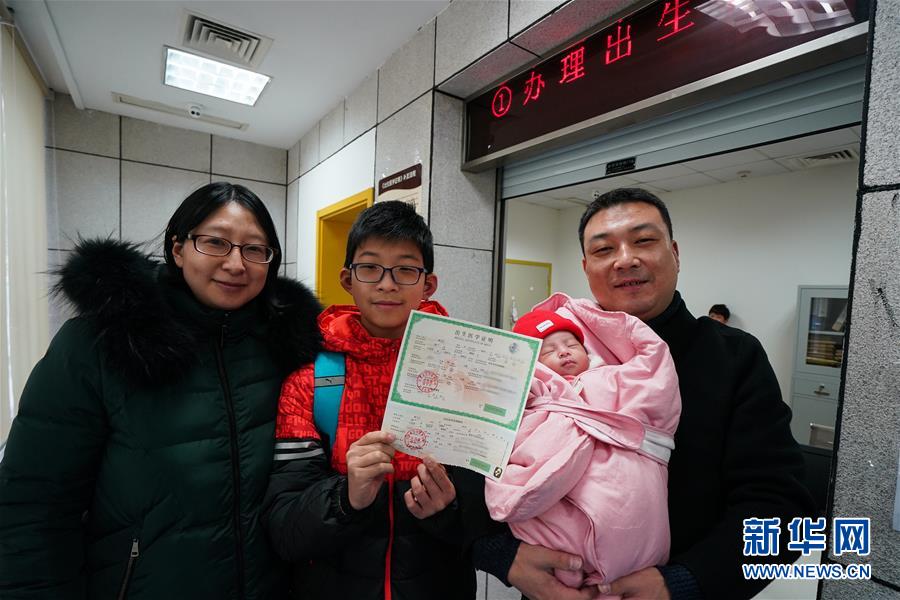 1月1日,在南京市婦幼保健院,為二胎寶寶領(lǐng)取新版出生醫(yī)學(xué)證明的顧先生一家四口合影留念。
