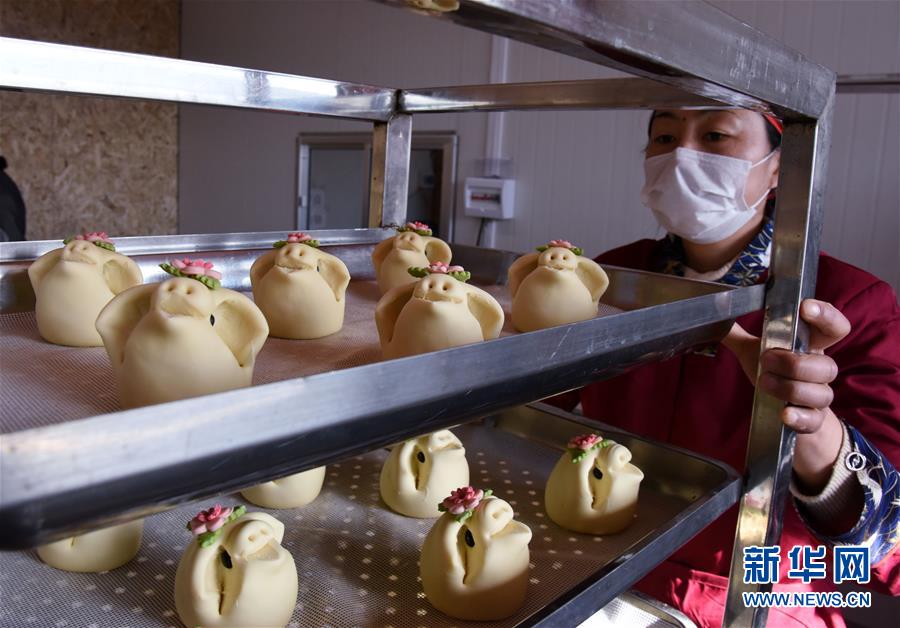 1月8日,工作人員準備將做好的花餑餑放入蒸箱。 新華社記者 李紫恒 攝