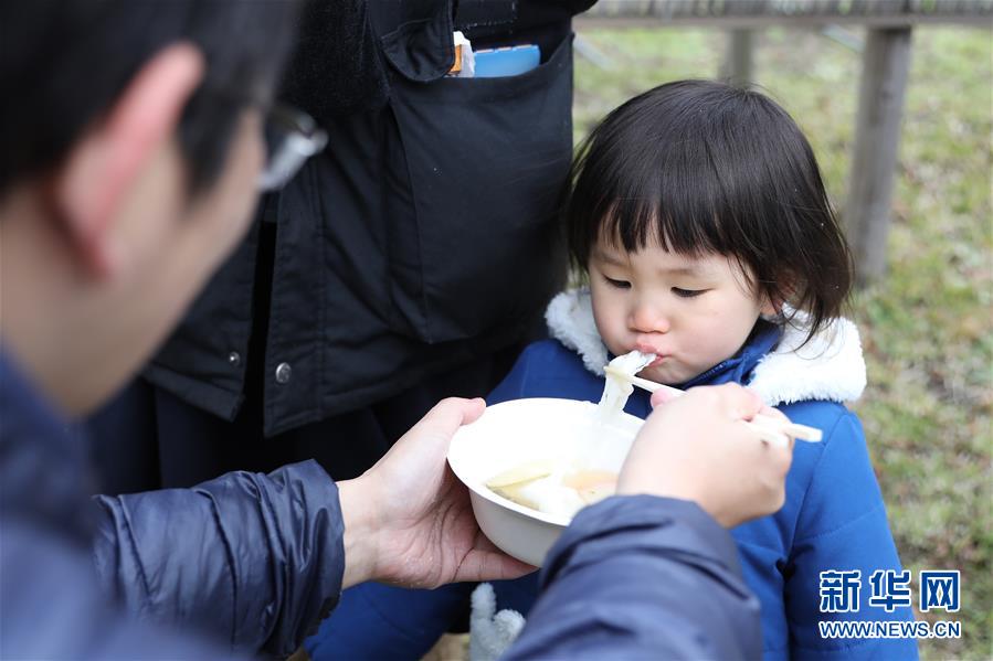 1月12日,在日本東京,一名兒童在家長的協(xié)助下?lián)v年糕。