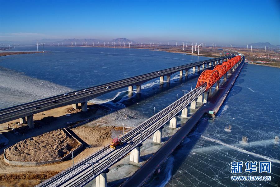 1月13日,中鐵三局的工人在京張高鐵官廳水庫特大橋進(jìn)行鋪軌作業(yè)(無人機(jī)拍攝)。 新華社記者 楊世堯 攝