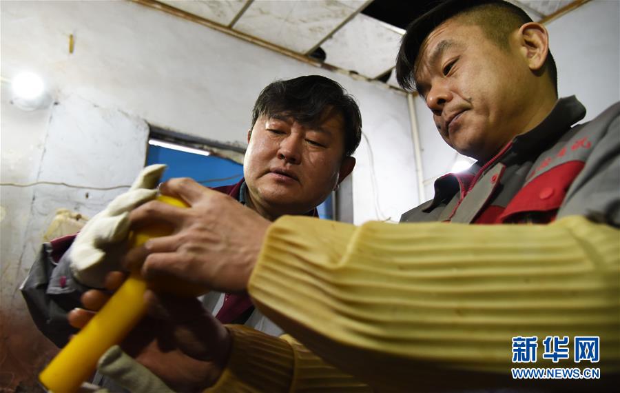 1月12日,孫云毅(左)在和工人交流一只雞油黃琉璃藝術(shù)品的打磨工藝。 新華社記者王凱攝