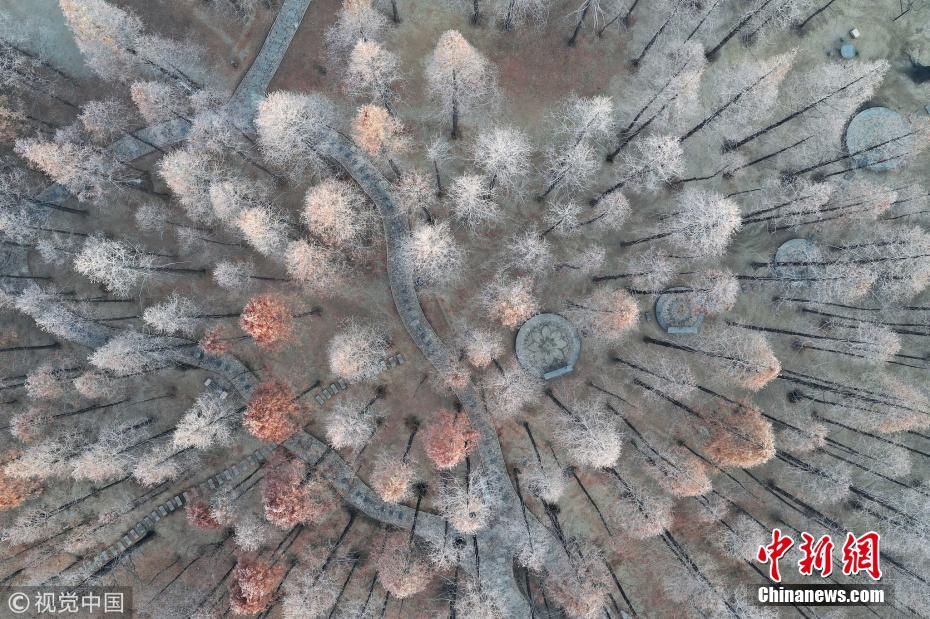 1月13日,霧散日升。河北省邢臺市大街小巷的樹枝上掛滿了潔白晶瑩的霜花,藍(lán)天下微風(fēng)吹拂銀絲閃爍,奇麗壯觀。給臘八節(jié)日增添了亮麗的風(fēng)景。霍紅軍 攝 圖片來源:視覺中國