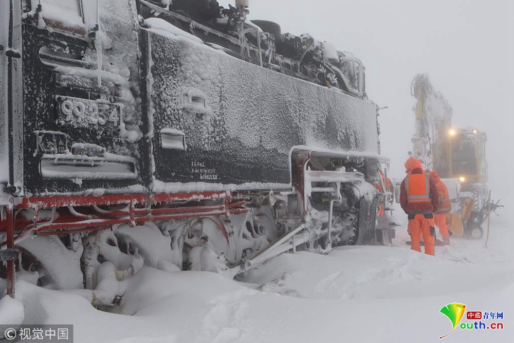 當(dāng)?shù)貢r間2019年1月9日,德國錫爾克,一輛蒸汽火車被大雪困住無法前進。