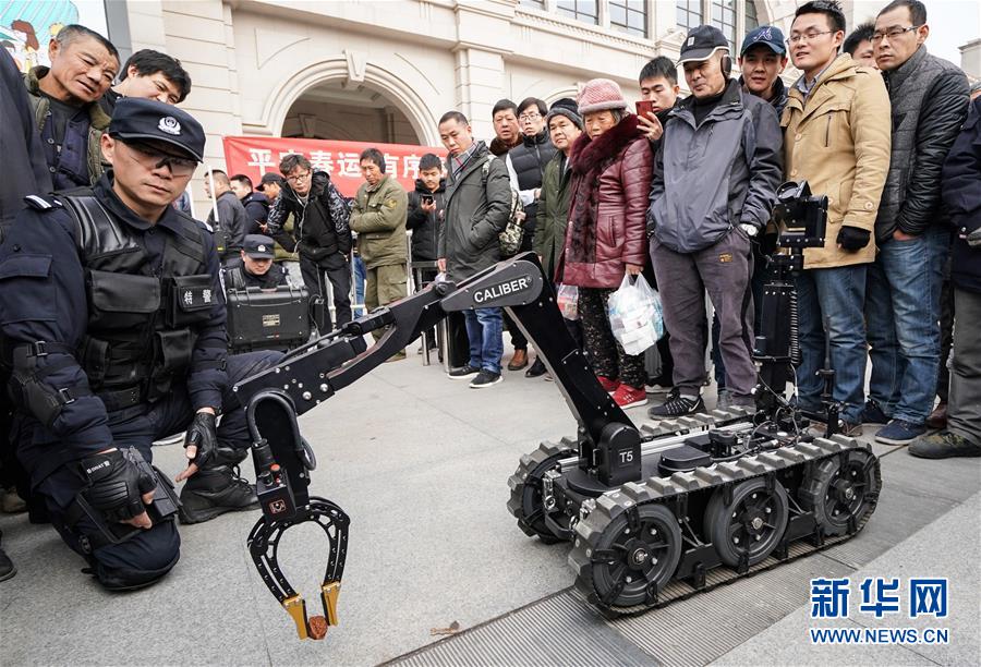 1月16日,旅客們?cè)谟^看警用排爆機(jī)器人演示。 當(dāng)日,武漢鐵路公安處在漢口火車站舉行警營(yíng)開(kāi)放日活動(dòng),讓旅客零距離接觸警務(wù)安全工作,營(yíng)造良好的春運(yùn)出行環(huán)境。 新華社記者程敏攝