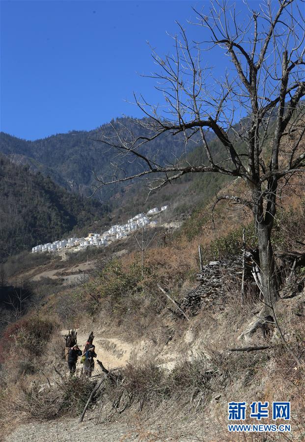 1月25日,在云南省蘭坪縣,余永妹(右)和褚福妹背柴回家,遠處是她們即將易地搬遷的新居。