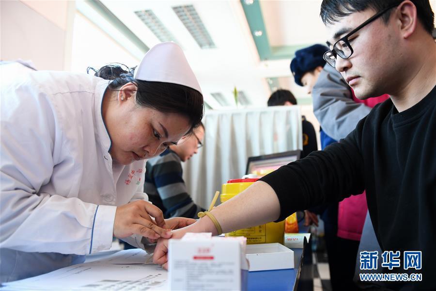 2月24日,志愿者在錫林郭勒盟中心血站排隊獻血。 內(nèi)蒙古自治區(qū)錫林郭勒盟“2·23”重大事故傷者正在錫林郭勒盟醫(yī)院、錫林郭勒盟蒙醫(yī)醫(yī)院接受救治。因用血需求量大,當?shù)匮獛鞄齑嬉欢鹊陀诰渚€。在當?shù)卣h下,各單位職工、市民紛紛前往錫林郭勒盟中心血站獻血。截至24日16時,已有220余名志愿者完成獻血,采集全血6.8萬毫升,機采血小板9個治療量。 新華社記者 劉磊 攝