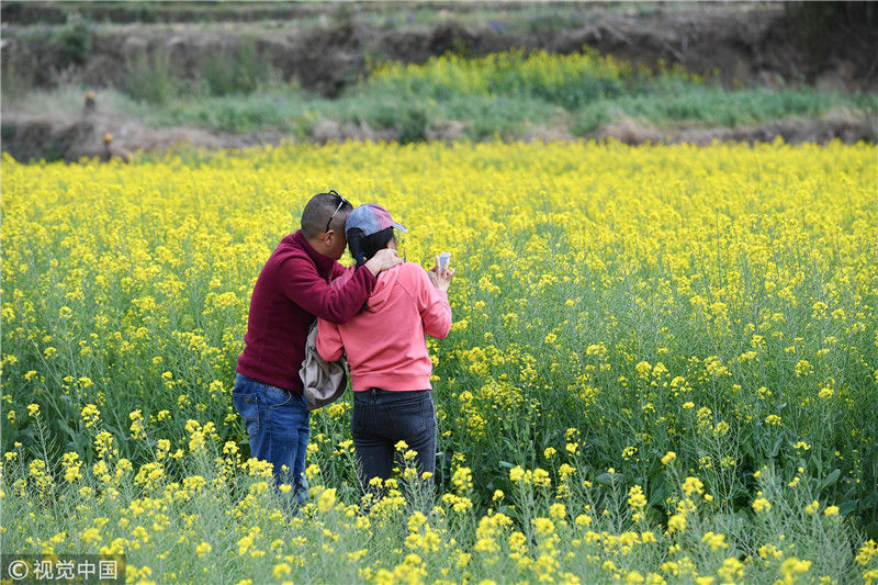 3月6日,游人在四川廣漢市西高鎮(zhèn)油菜花田里游玩。