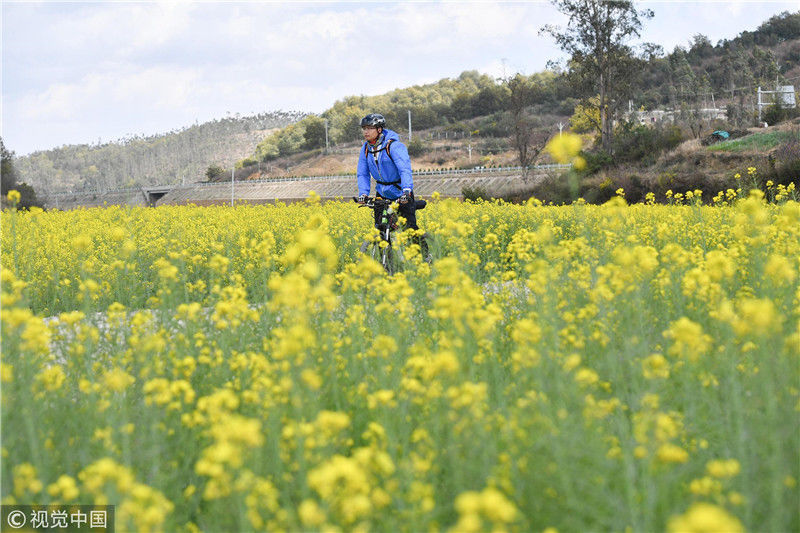 2019年3月1日,游客在花海中騎行。近日,位于云南省安寧市的大片油菜花進入盛花期,吸引民眾到此賞花。