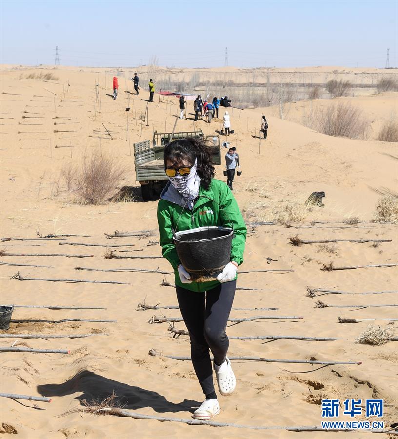 3月31日,一名青年志愿者正在取水澆灌。 當(dāng)日,200余名中韓兩國青年志愿者來到內(nèi)蒙古自治區(qū)達(dá)拉特旗庫布其沙漠種樹。2006年起,中國國際青年交流中心與韓國韓中文化青少年協(xié)會(huì)組織兩國青年志愿者在庫布其沙漠植樹,參與防沙固沙項(xiàng)目。截至目前已植樹850多萬株,造林3萬多畝。 新華社記者 劉磊 攝