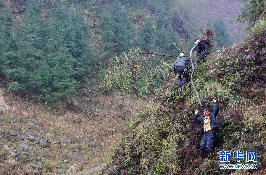 這是黔桂烏英苗寨的群眾在山上抬樹(shù)苗,準(zhǔn)備用來(lái)美化居住環(huán)境(3月16日攝)。