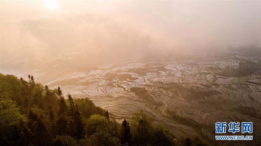 這是在云南省元陽縣拍攝的晨曦中的哈尼梯田美景(4月4日無人機拍攝)。哈尼梯田位于云南省哀牢山南部,以哈尼族為主的當(dāng)?shù)厝罕娗О倌陙砩幌⒃诖蟮厣稀暗窨獭背鲞@一農(nóng)耕文明奇觀。春日里,漫山的水稻梯田與云海、森林、村莊形成一幅美麗的畫卷,吸引眾多海內(nèi)外游客前來觀賞。新華社記者 胡超 攝