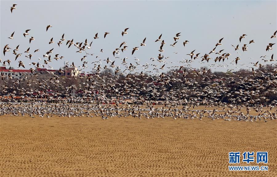 4月4日,一群候鳥在秦皇島市沿海濕地飛翔。近日,大批候鳥飛抵河北省秦皇島市沿海濕地,出現(xiàn)“萬鳥臨海”奇觀。秦皇島沿海濕地鳥類食物豐富,每年春、秋兩季,大批候鳥遷徙經過這里。新華社記者 楊世堯 攝