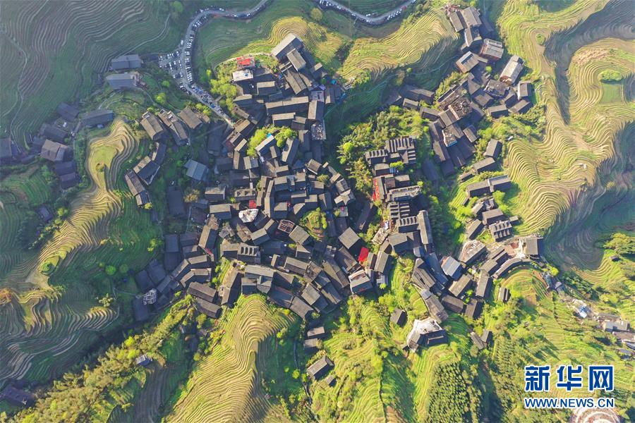 龍勝各族自治縣和平鄉(xiāng)平安村一景(4月7日無人機拍攝)。連日降雨過后,廣西龍勝各族自治縣和平鄉(xiāng)平安村的壯族村寨迎來久違的朝陽。 新華社記者 曹祎銘 攝