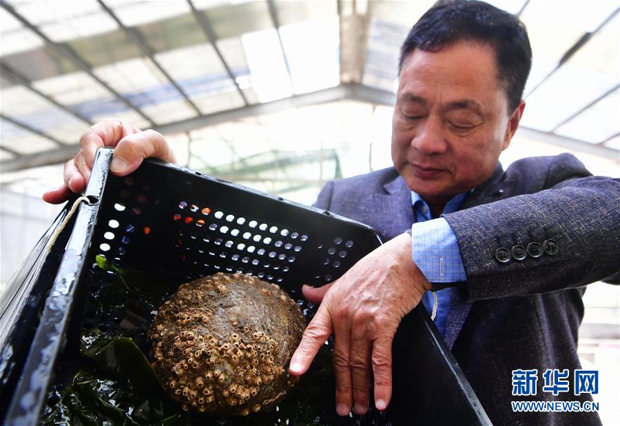 4月18日,連江縣筱埕鎮(zhèn)一家鮑魚養(yǎng)殖育種企業(yè)的技術(shù)人員展示新培育的美國綠鮑新品種。