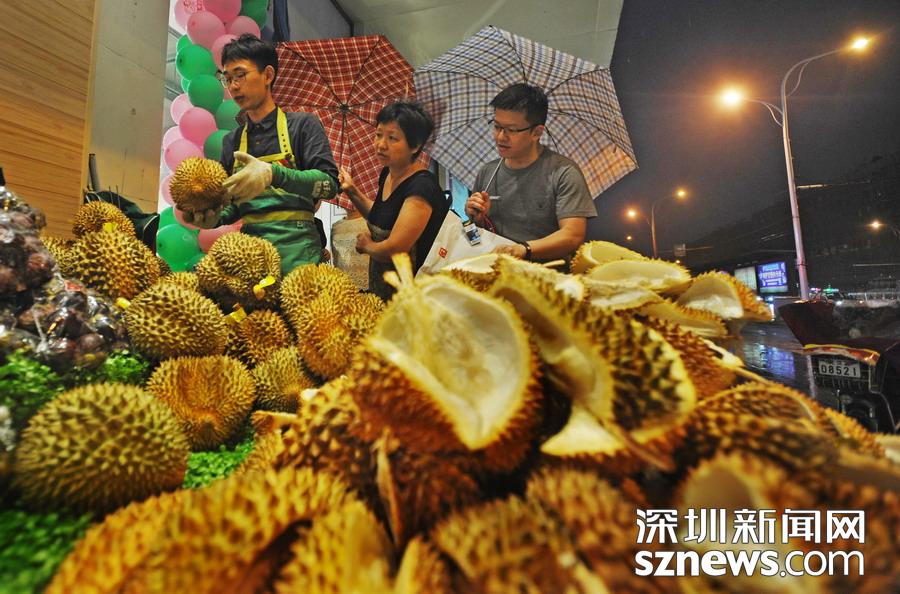2017年6月5日夜里,武漢一家水果店正進行金枕榴蓮打折促銷,門前堆積如山的榴蓮殼頗為壯觀,不少市民聞著榴蓮散發(fā)的濃郁味道前來排隊選購,雨夜里食客們依舊絡(luò)繹不絕。