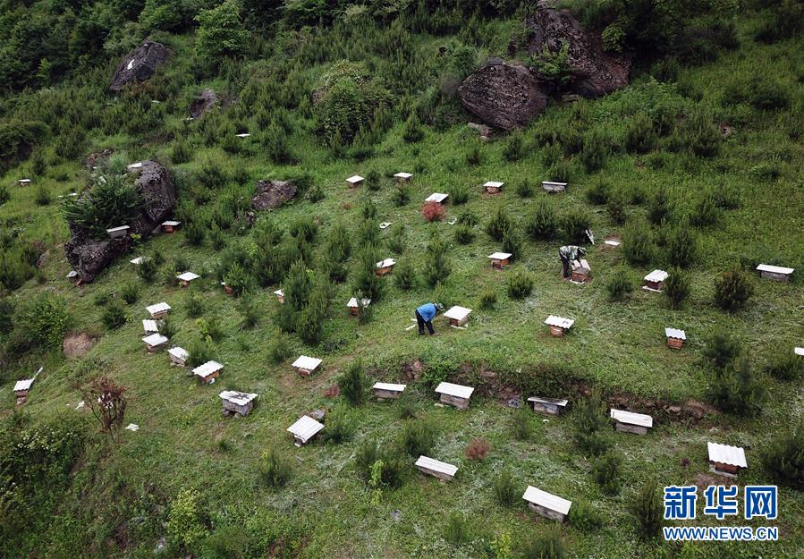 5月10日,在甘肅省隴南市徽縣大河店鎮(zhèn)硬灣村,蜂農(nóng)查看蜂箱情況(無(wú)人機(jī)拍攝)。 甘肅省隴南市徽縣大河店鎮(zhèn)硬灣村位于秦巴山區(qū)深處,2017年,在當(dāng)?shù)卣姆龀窒拢堁吕铣裁垧B(yǎng)殖農(nóng)民專業(yè)合作社成立,蜂農(nóng)們將傳統(tǒng)養(yǎng)蜂技藝和現(xiàn)代加工方式相結(jié)合,并通過(guò)電商等渠道打開(kāi)銷路,有效帶動(dòng)了當(dāng)?shù)刎毨Т迕衩撠氈赂?。目前整個(gè)合作社共有蜂箱2000余個(gè),每箱每年可帶來(lái)三四千元的收入。 新華社記者 馬寧 攝