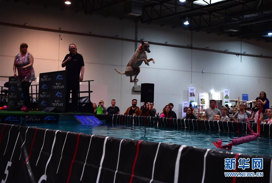 5月19日,在德國(guó)多特蒙德舉行的寵物展上,一只獵犬參加跳水比賽。 為期三天的德國(guó)多特蒙德“狗和貓”寵物展19日落幕。寵物展期間,人們帶著自己的“萌寵”來(lái)到會(huì)場(chǎng),參與寵物跳水、舞蹈、選美等趣味比賽,并與其他寵物愛(ài)好者及展商交流互動(dòng)。 新華社記者逯陽(yáng)攝