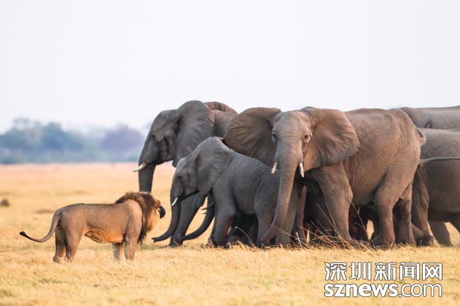 英國攝影師詹姆斯(James Gifford)在博茨瓦納喬貝國家公園拍到一群獅子獵食大象的精彩畫面。在詹姆斯的鏡頭下,一頭母獅跳到了一頭小象的背上想要將其拿下,但僅憑一己之力又不能做到。但當(dāng)母獅的后援抵達(dá)時,象群也趕到了現(xiàn)場。最終,小象回到了象群中獲得庇護(hù),而獅群也不得不悻悻離去。