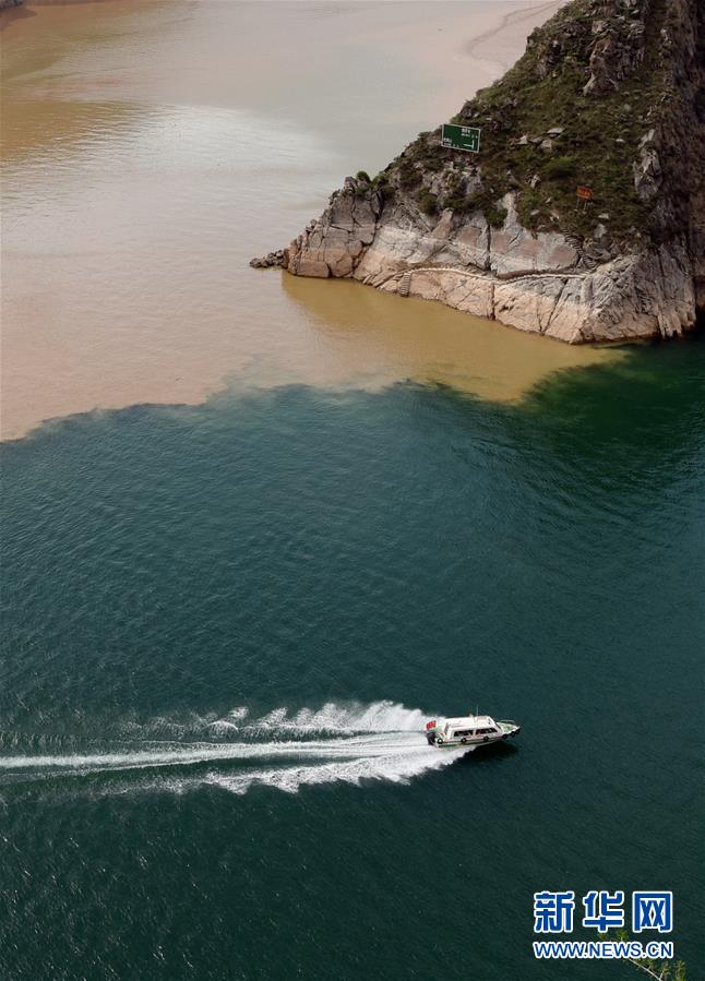 6月2日,在甘肅省臨夏回族自治州永靖縣劉家峽水庫,一艘快艇在洮河和黃河的匯合水域行駛。
