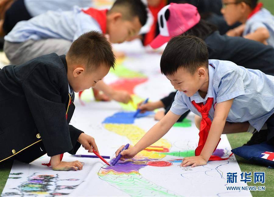6月5日,陜西師范大學(xué)附屬小學(xué)的學(xué)生在長卷上畫龍舟。新華社記者 張博文 攝