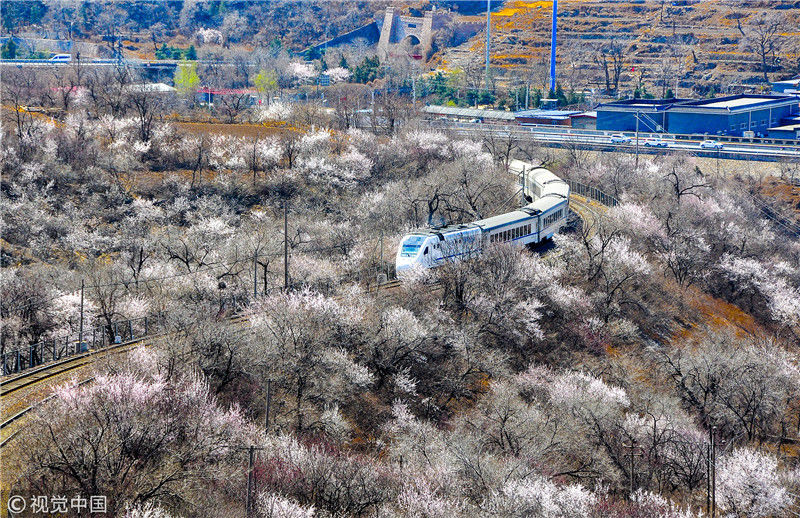 2019年3月22日,北京居庸關(guān)附近的山花盛開,S2線列車穿行在花海之中,構(gòu)成一幅美麗的畫面。時永平/千龍圖像/視覺中國 編輯/陳進(jìn)