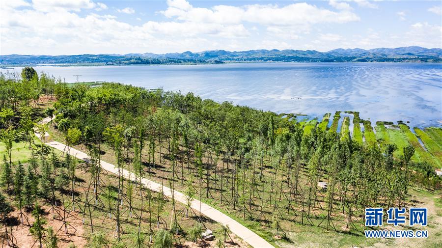6月20日無(wú)人機(jī)拍攝的草海國(guó)家級(jí)自然保護(hù)區(qū)造林涵湖工程一隅。 新華社記者 陶亮 攝
