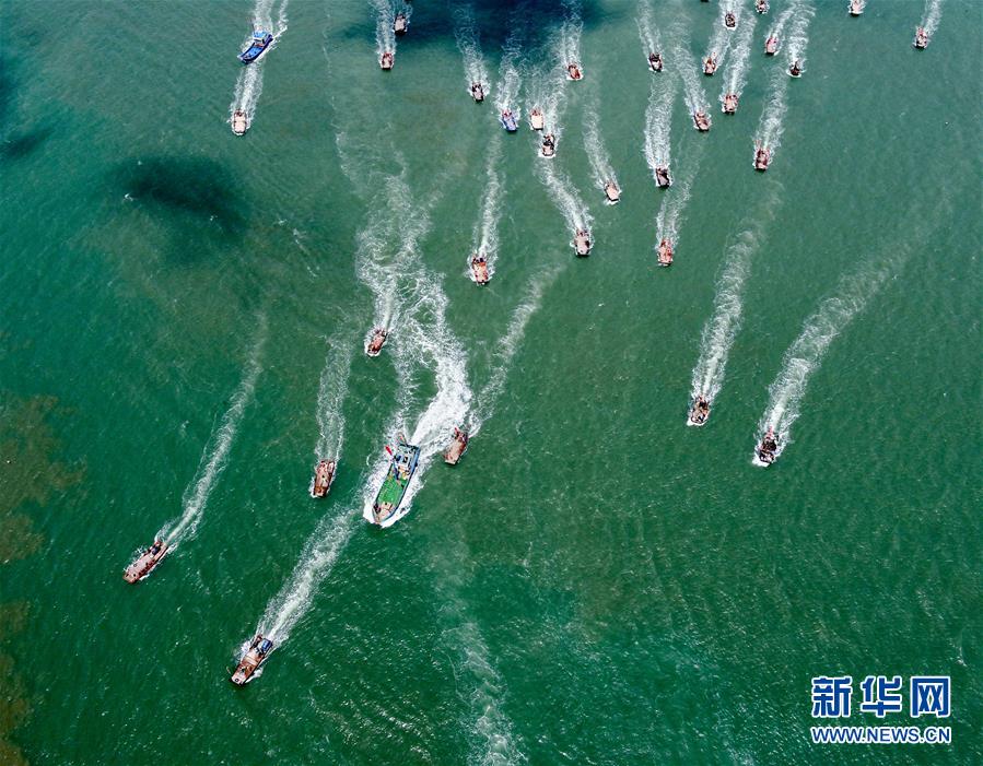 8月3日,在首屆福清開漁節(jié)上,漁船駛向大海(無人機(jī)拍攝)。新華社記者姜克紅攝