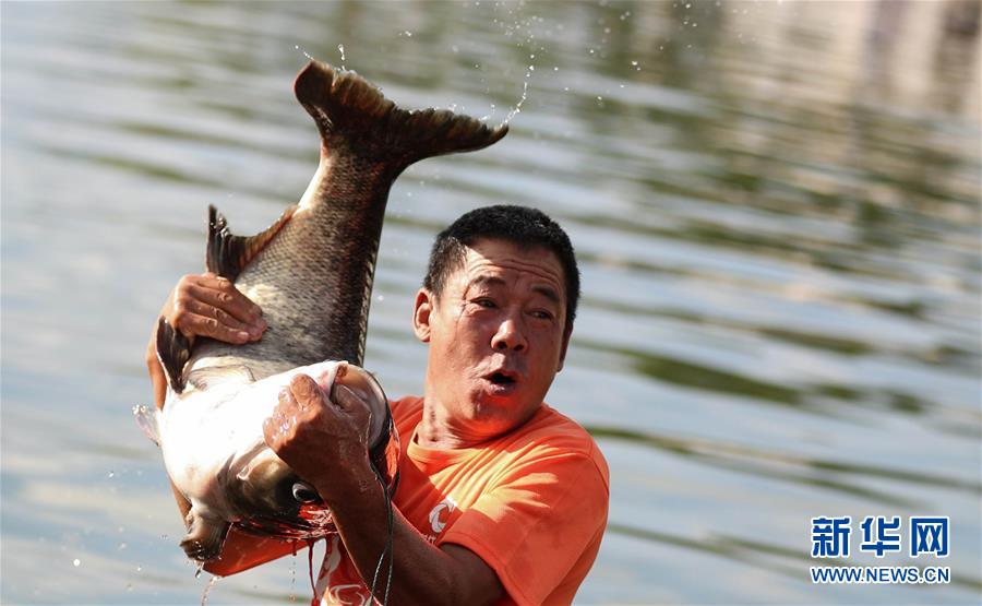 7月27日,在西昌邛海,一名漁民捕得一條大魚。新華社記者江宏景攝