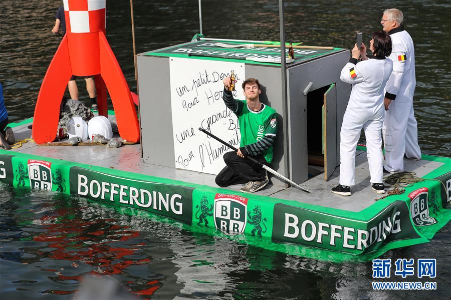 8月15日,在比利時(shí)南部小城迪南的默茲河上,人們參加“浴缸劃船節(jié)”的表演。新華社記者 張鋮 攝