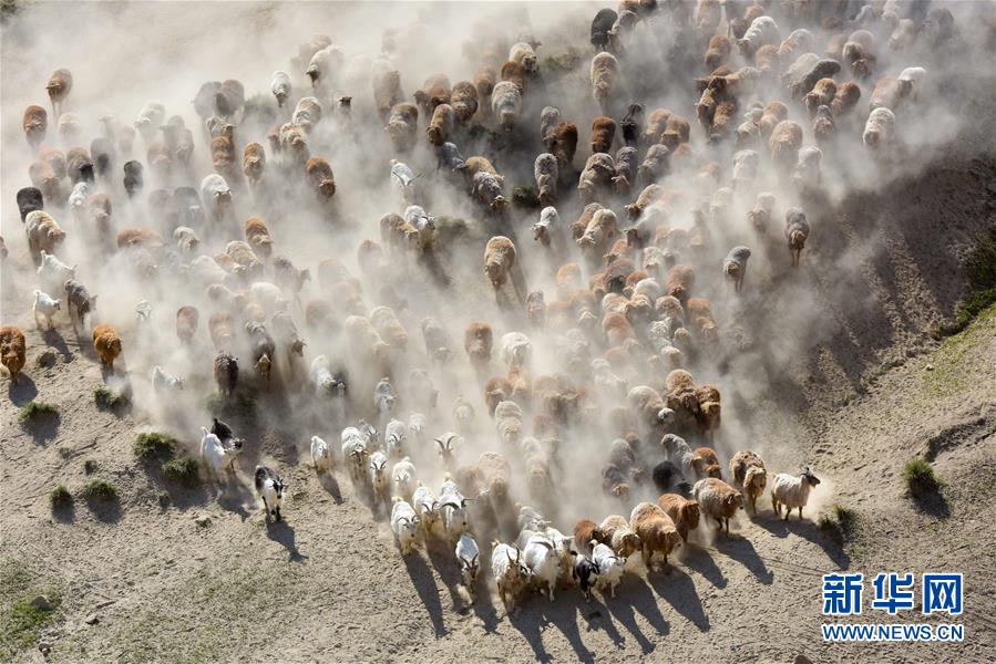 新疆阿勒泰地區(qū)福??h牧民趕著牲畜向夏季牧場(chǎng)遷徙(6月6日無人機(jī)拍攝)。新華社記者丁磊攝
