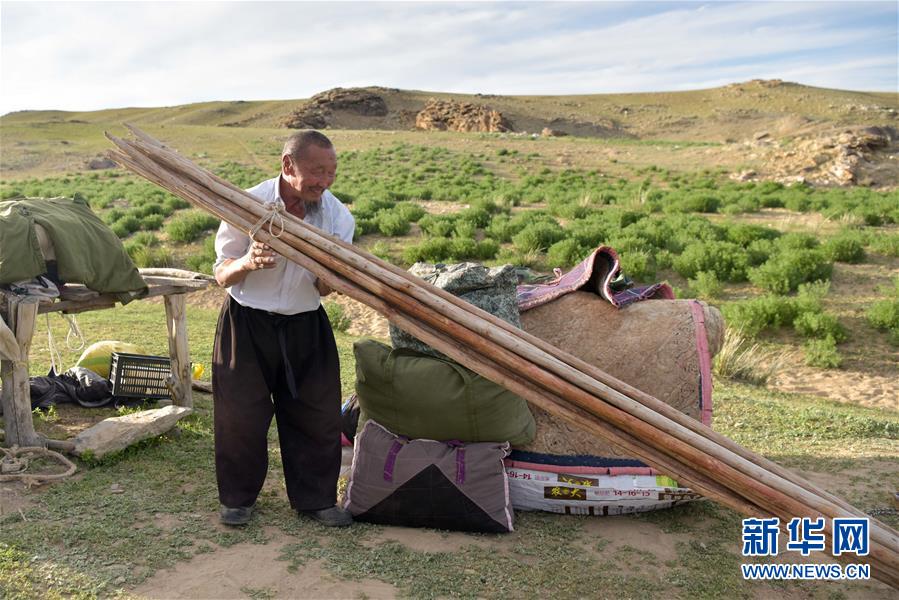 在新疆阿勒泰地區(qū)福海縣牧區(qū),牧民在制作氈房飾品(6月5日攝)。眼下,隨著新疆多地夏季牧場(chǎng)開放,阿勒泰地區(qū)的哈薩克族牧民又迎來了轉(zhuǎn)場(chǎng)季,他們趕牛羊,逐水草,游走在阿爾泰山間的牧道上,形成一道流動(dòng)的風(fēng)景。轉(zhuǎn)場(chǎng)時(shí),牧民們攜子女及親屬騎馬趕著牲畜徐徐前行,駝隊(duì)或馬隊(duì)馱著全部家當(dāng),走到哪里,晚上就宿營在哪里。與傳統(tǒng)轉(zhuǎn)場(chǎng)方式不同,隨著生活條件的改善,一些牧民會(huì)雇汽車將家中的大件物品提前運(yùn)送到目的地,轉(zhuǎn)場(chǎng)途中只需準(zhǔn)備食物和簡易氈房便可以輕裝前行……新華社記者丁磊攝