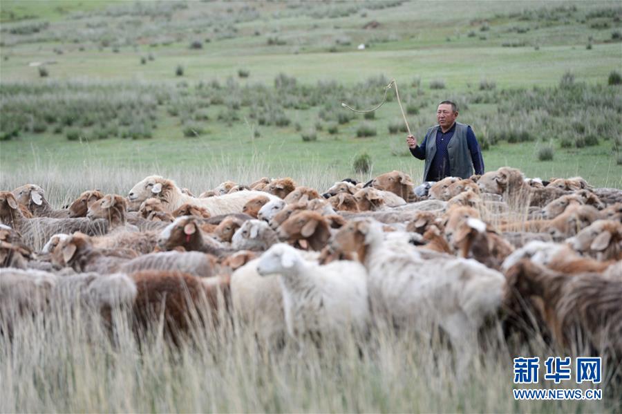 在新疆阿勒泰地區(qū)福海縣牧區(qū),牧民在山坡上放羊(6月7日攝)。新華社記者丁磊攝