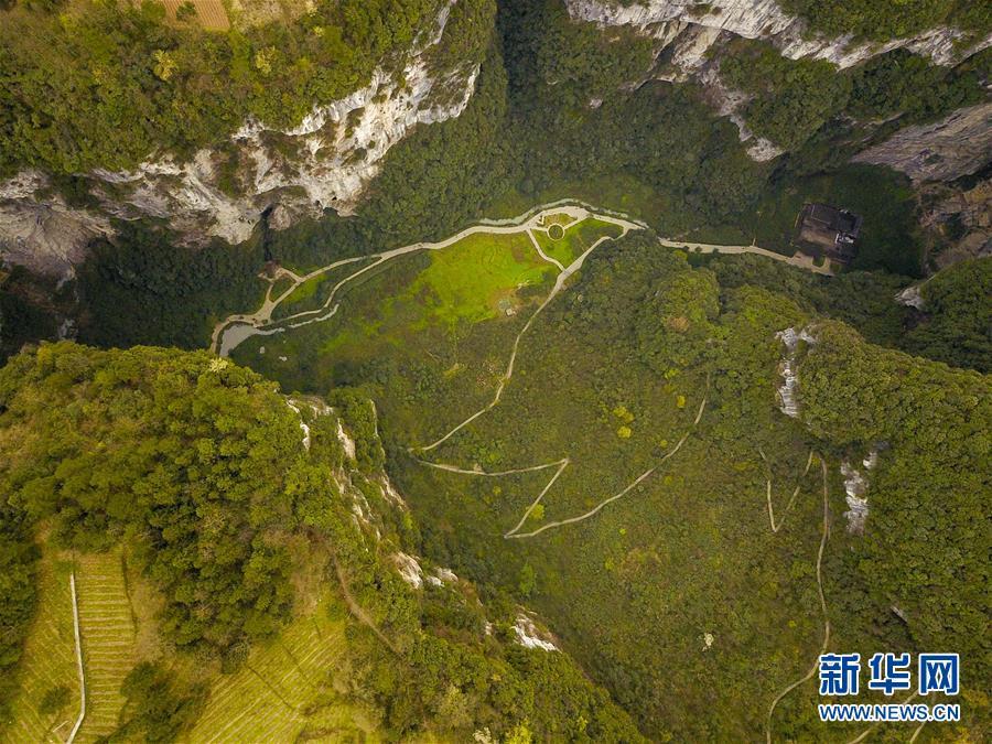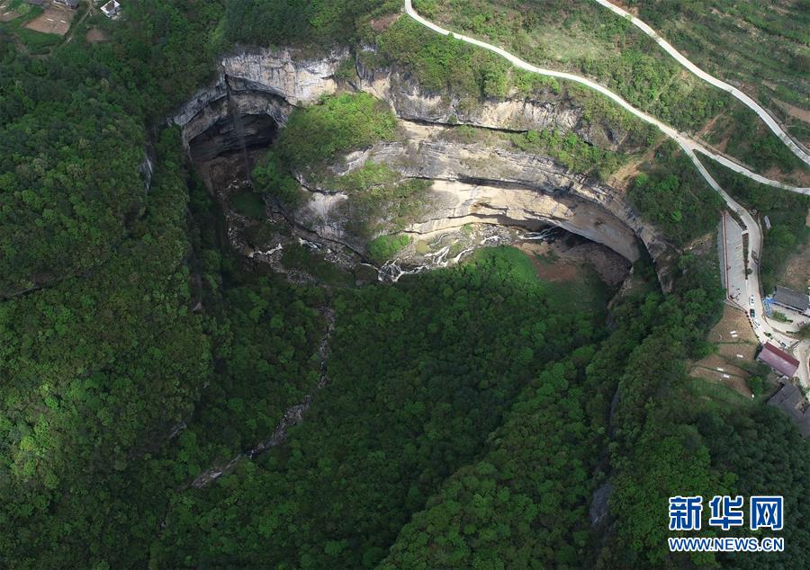 4月22日無(wú)人機(jī)拍攝的地洞河天坑。 新華社記者 張博文 攝
