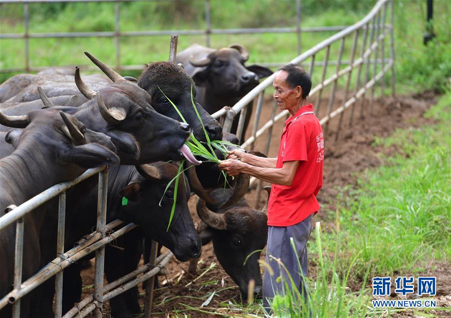 在廣西融安縣大良鎮(zhèn)古蘭村古蘭屯養(yǎng)牛基地,68歲的韋肇翠在喂牛(8月18日攝)。韋肇翠是養(yǎng)牛基地的飼養(yǎng)員,每個(gè)月有2800元的工資。 新華社記者 黃孝邦 攝