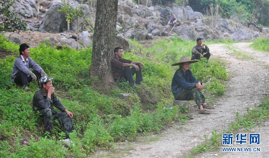 種樹結(jié)束后,龍革雄(右二)在山上休息(2013年5月15日攝)。新華社記者 黃孝邦 攝