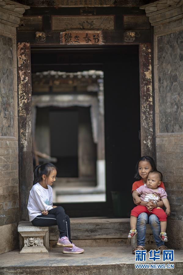 石屏縣異龍鎮(zhèn)符家營(yíng)村的小朋友鄭淇(左)與小伙伴在村里的老屋門前休息(8月8日攝)。新華社記者 江文耀 攝