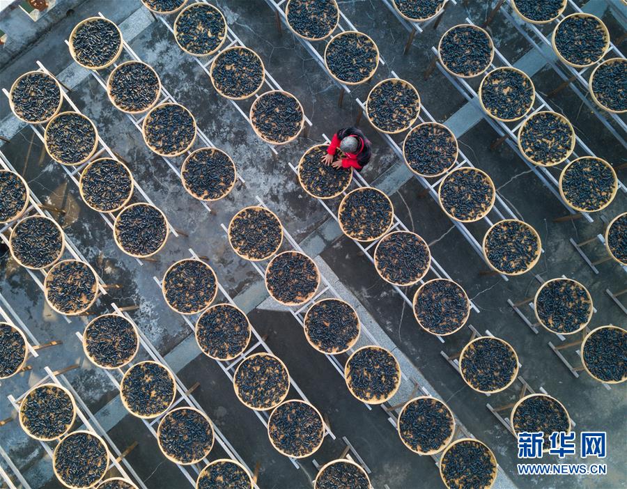 在福建省永春縣岵山鎮(zhèn)茂霞村熟地文創(chuàng)園,村民在晾曬用當(dāng)?shù)貍鹘y(tǒng)手藝制作的藥材——熟地(1月28日無人機拍攝)。 新華社記者 宋為偉 攝