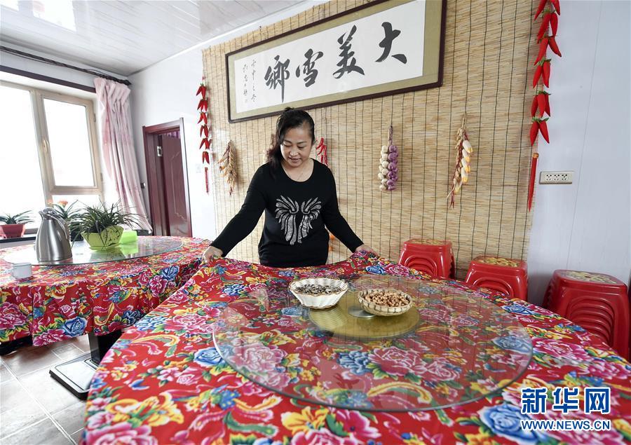 在舒蘭市二合屯,何翠華在自家農(nóng)家樂內(nèi)整理桌布(1月25日攝)。二合雪鄉(xiāng)的發(fā)展讓二合屯村民何翠華將“農(nóng)閑”變?yōu)椤稗r(nóng)忙”,一個雪季能夠收入近4萬元。 新華社記者許暢攝