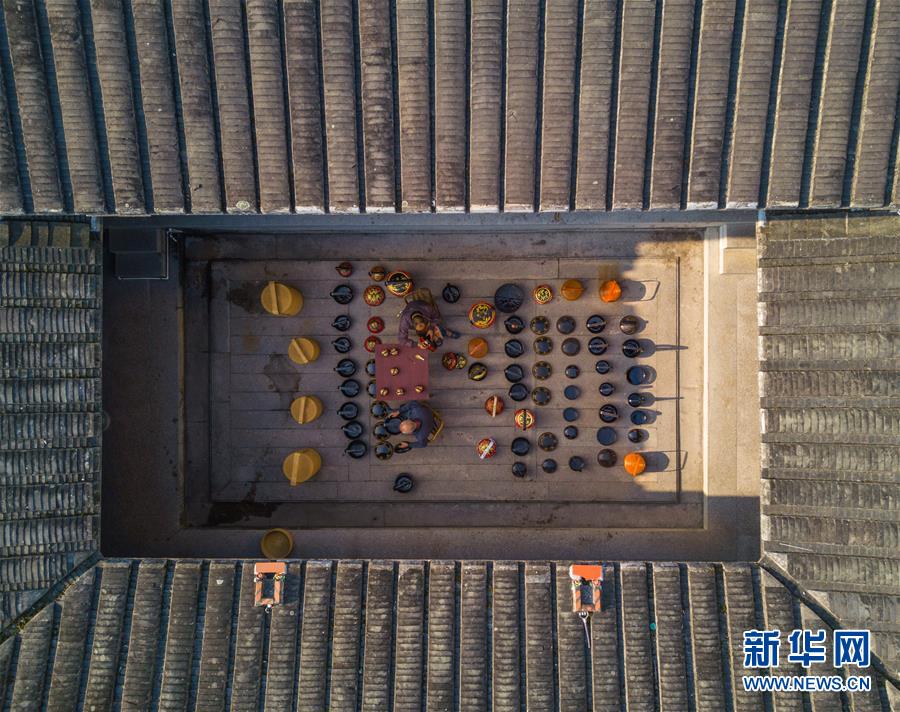 在福建省永春縣仙夾鎮(zhèn)龍水村,村民在老宅制作當(dāng)?shù)靥厣峄@(1月28日無人機拍攝)。 新華社記者 宋為偉 攝