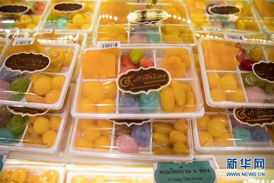 9月1日,店員在泰國曼谷著名的“九姐妹甜點”店整理貨架。