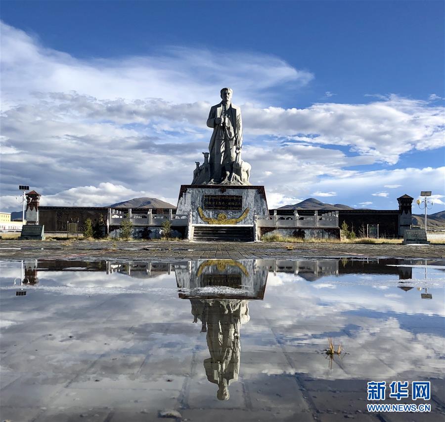 這是在青海省玉樹藏族自治州治多縣用手機(jī)拍攝的“環(huán)保衛(wèi)士”杰?!に髂线_(dá)杰的雕像(9月12日攝)。新華社記者 鄒樂 攝