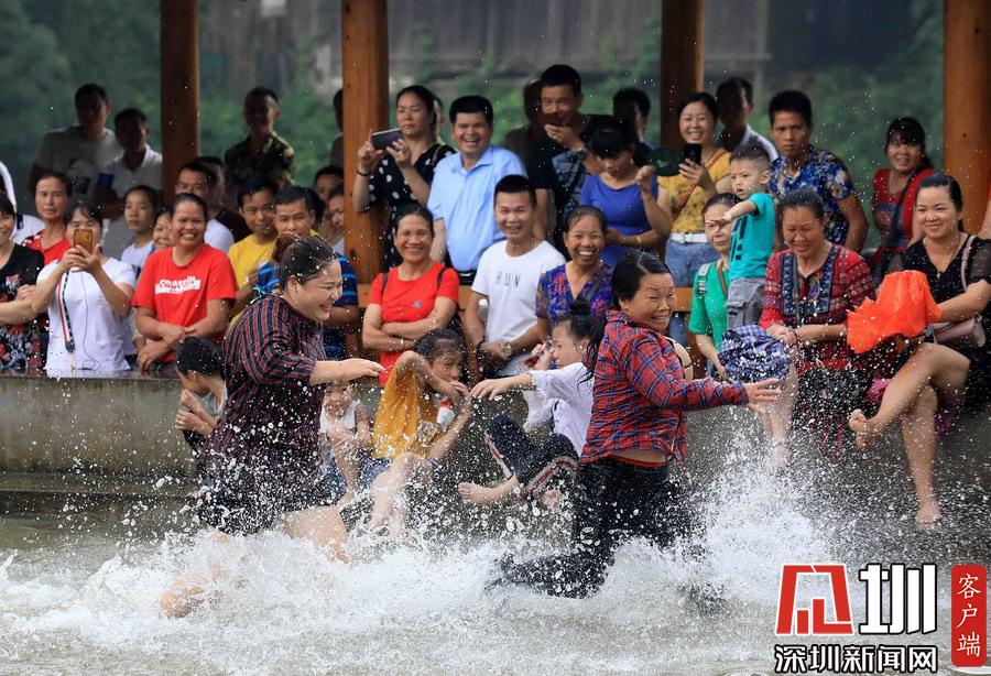 在廣西柳州市融安縣長安鎮(zhèn)安寧村大袍屯,人們在水上籃球比賽中拼搶。