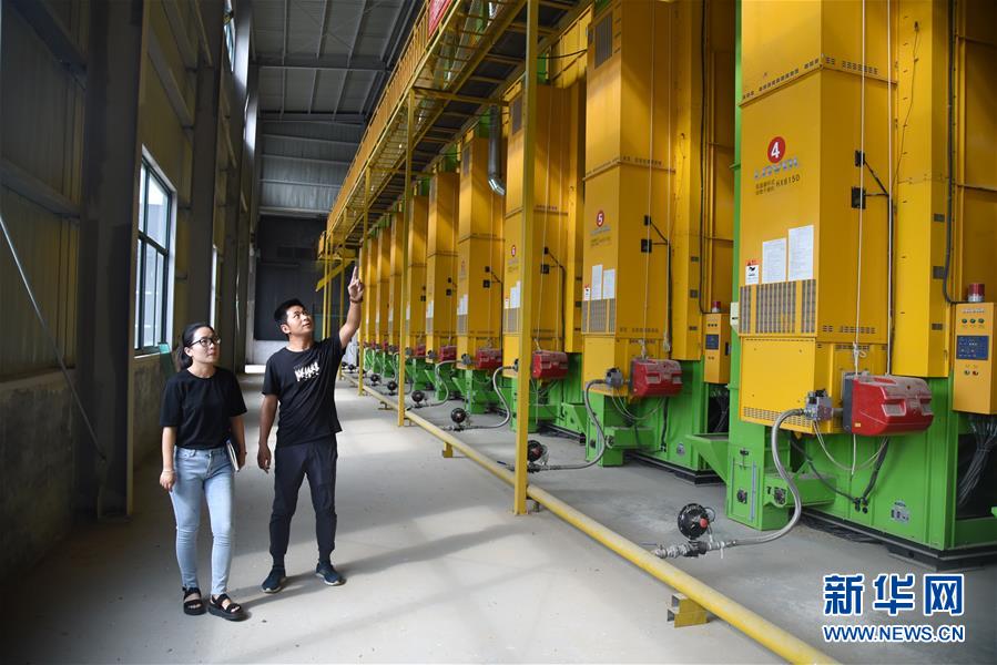 在山東省德州市平原縣的農(nóng)場(chǎng)里,楊春雷(右)和卜璐璐在烘干車間查看引進(jìn)的高科技設(shè)備——低溫循環(huán)式谷物干燥機(jī)(8月22日攝)。 新華社記者 王凱 攝