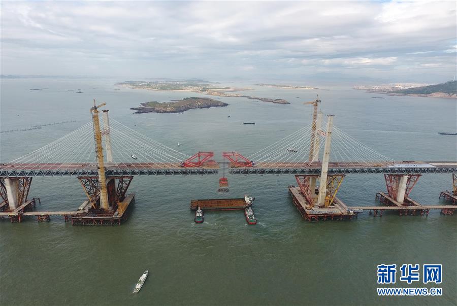 9月21日,平潭海峽公鐵大橋鼓嶼門(mén)航道橋鋼桁梁被架梁起重機(jī)穩(wěn)穩(wěn)地提升起來(lái)(無(wú)人機(jī)拍攝)。新華社記者林善傳攝