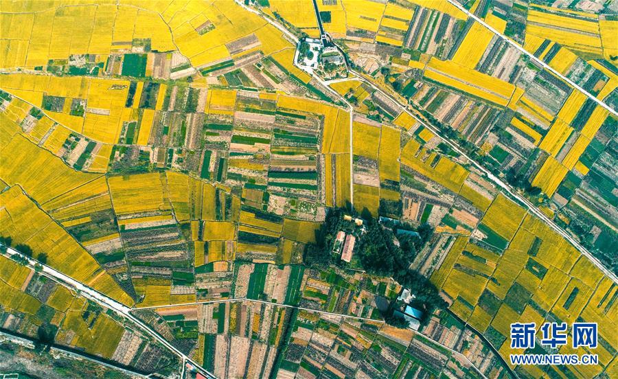 這是9月30日無人機(jī)拍攝的河北省涉縣白芟村的稻田。 近日,位于太行山下的河北省涉縣白芟村上千畝水稻逐漸成熟。從空中俯瞰,猶如一塊塊“調(diào)色盤”,美不勝收。 新華社記者 王曉 攝