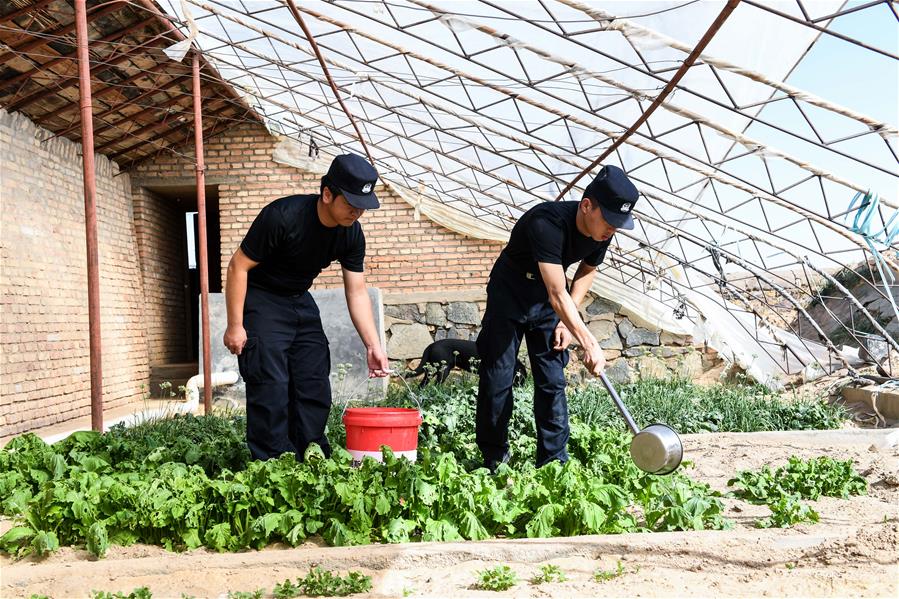 9月27日,內(nèi)蒙古自治區(qū)額濟納旗算井子邊境派出所民警崔現(xiàn)浦(右)和阿拉塔納在派出所大棚里給蔬菜澆水。新華社記者劉磊攝