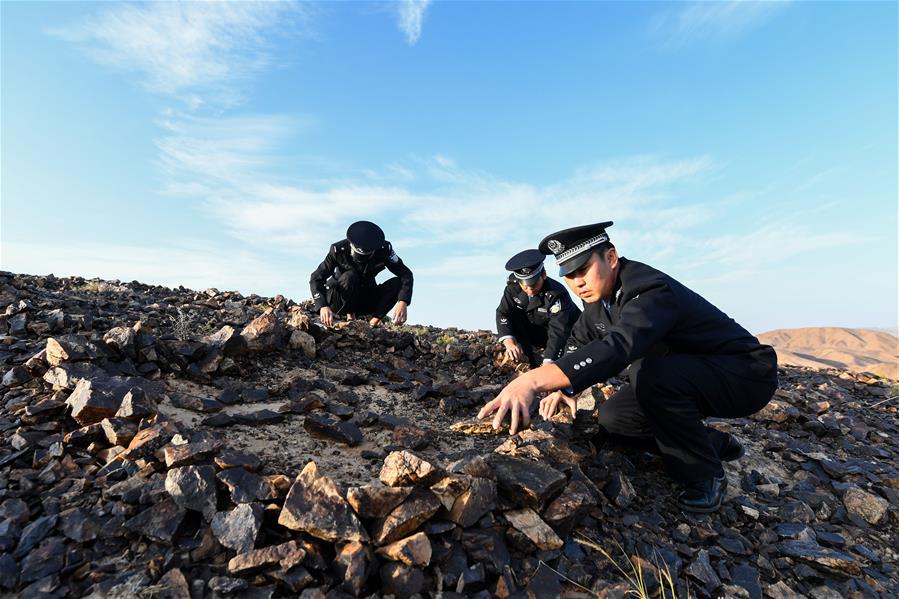 9月27日,內(nèi)蒙古自治區(qū)額濟納旗算井子邊境派出所民警在大紅山上維護整理石塊。新華社記者劉磊攝