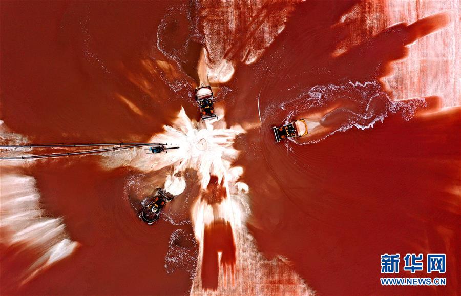 魯北鹽場(chǎng)工人在鹽池中收獲海鹽(10月9日無(wú)人機(jī)拍攝)。新華社記者 朱崢 攝