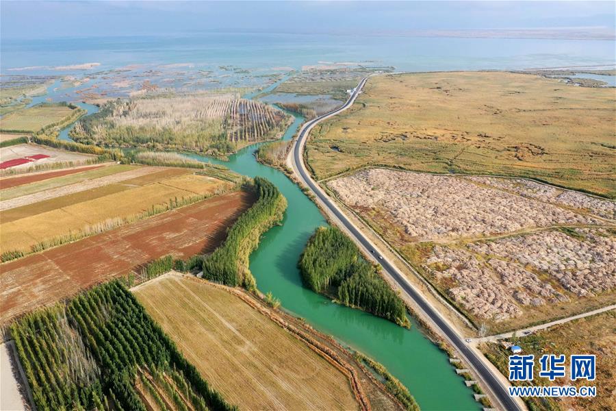 開(kāi)都河支流匯入博斯騰湖(10月12日無(wú)人機(jī)拍攝)。入秋以來(lái),新疆博斯騰湖碧波蕩漾,美景如畫(huà),吸引各地游客前來(lái)游玩。新華社記者丁磊攝